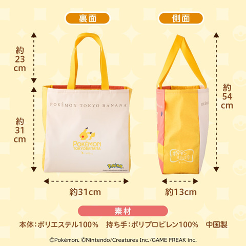 今回、「ポケモン東京ばな奈8個入」と「はみ出しチョコのクッキーサンド12枚入」に加えトートバッグ1個がセットになった商品が新登場。バッグの表面にはピカチュウが大きくデザインされていて、裏面にはオリジナルのロゴがあしらわれている。