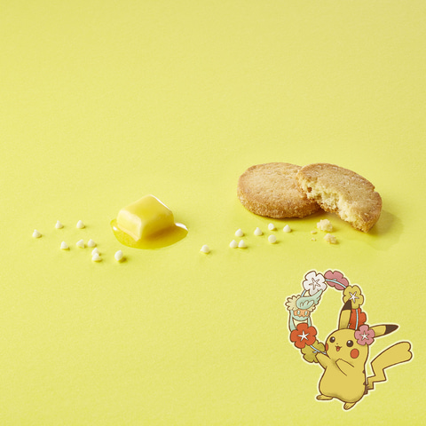 本商品は、風味豊かな素材にこだわり抜いたサブレ。チョコレートを主役にした、カカオ・ピスタチオ・レモンの3種のフレーバーが楽しめる。個包装にはポケモンたちのイラストが入っている。花がちりばめられたデザインの缶は、洗練されたエンボス加工になっており、キュワワーや花をつけてもらったピカチュウ・イーブイ・チコリータが描かれている。