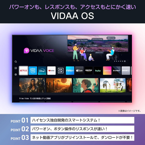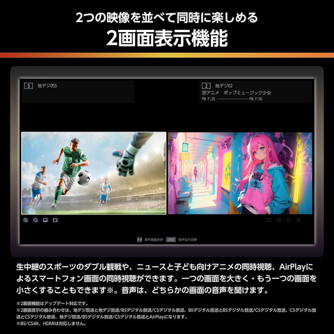 機能を絞り、優れたコストパフォーマンスを実現したモデル。iPhone&Android対応「スクリーンシェア」搭載で、スマホで撮った写真や動画も、テレビで楽しめる。さらに、ネット映像高画質処理にも対応。画質エンジン映像を解析し、高いコントラストと自然な色彩で表情豊かに再現する。AI自動やダイナミック、クリア音声、スポーツ、映画など、さまざまな音質モードが搭載されている。また、「低遅延ゲームモード」も搭載、操作のタイムラグを抑え、シビアなゲームにも対応する。