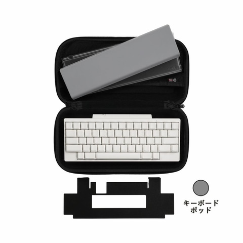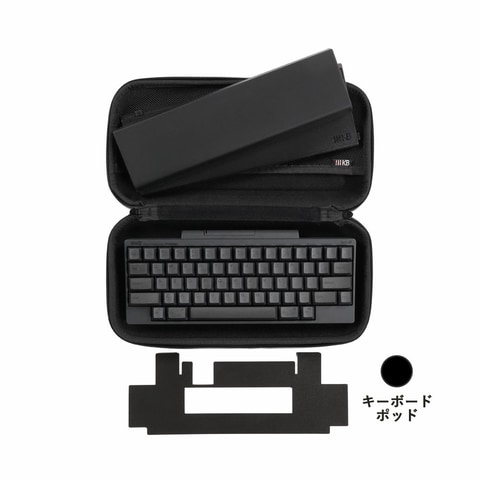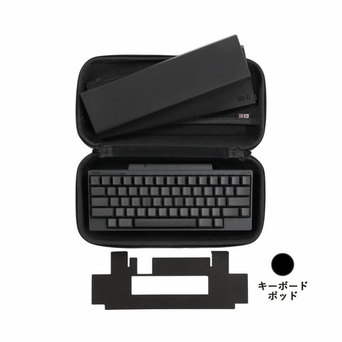 HHKBとオプション品を安全に持ち運ぶためのセミハードケース。本セットに含まれるHHKB本体と全てのオプション品を、この1つのケースにまとめて収納できる。外面素材には耐久性にもすぐれたEVA(Ethylen-Vinyl Acetate/エチレン-酢酸ビニル共重合樹脂)を採用し、内面にはクッション素材を備えることで、持ち歩く際の衝撃や傷などから守る。