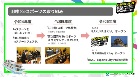 羽咋市では、2022年(令和4年)から自治体としてeスポーツ事業に取り組んでいる。当初は単発のイベント開催が主だったが、2024年(令和6年)に羽咋駅前に交流施設「LAKUNAはくい」を開設した際、その3階に「eスポーツスタジオ」を開設。同時に様々な事業を包括した「HAKUIeSportsCityプロジェクト」をスタートした。