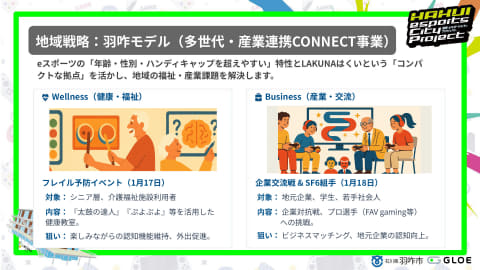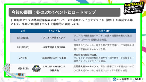 2026年の3月までには、シニア向けに「太鼓の達人」や「ぷよぷよ」での健康増進を目指す「フレイル予防イベント」、地元の企業と若者がゲームを通じてお互いを知りマッチングに役立つような「企業交流戦」、「広域連携eスポーツ事業」、「LAKUNA HAKUI CUP 決勝大会」などが予定されている。