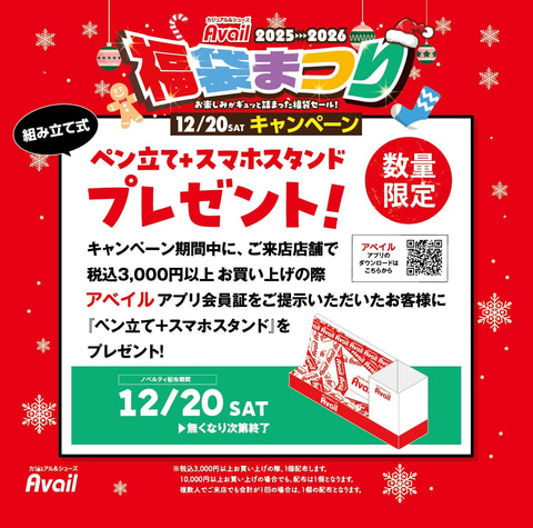 また、12月20日より店舗で3,000円以上購入し、アベイルアプリの会員証を提示した人を対象に、アベイルオリジナルの「ペン立て+スマホスタンド」をプレゼントするキャンペーンも実施する。