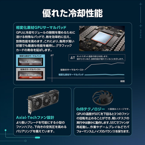 また、GPUとサーマルモジュールの隙間を溶けて埋めることで、優れた熱伝導性と熱放散を実現し、重負荷時でもグラフィックスカードの最適な性能と長寿命を確保する。GPU温度が50度未満でファンが停止、55度以上で再起動し、性能と静音性を両立する。