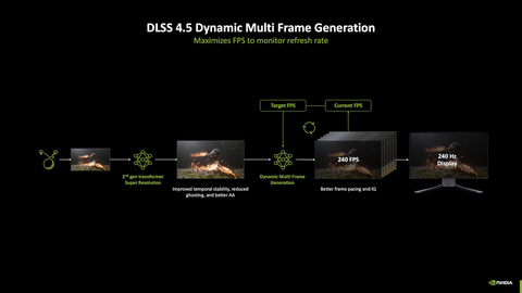 NVIDIAは「DLSS 4.5」によって、パストレーシングを利用した状態でも、4K/240Hzのゲームプレイが可能になるとしている。最大6倍の「ダイナミックマルチフレーム生成」は2026年春よりGeForce RTX 50シリーズで利用可能となる。