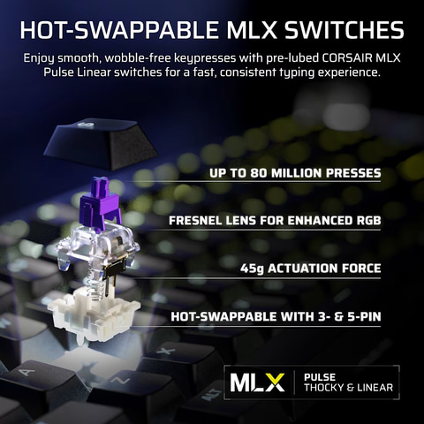 キーボード部分は、キースイッチに「CORSAIR MLX Pulse」を搭載しており、6層の消音フォームによってタイピング中のノイズを低減。最大8,000Hzのポーリングレート、SOCDに相当する「FLASHTAP」にも対応している。