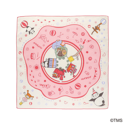 生地の端を赤色の糸で縁取ったメロー巻きと、あたたかな色合いがノスタルジックな印象を与える大判ハンカチ。全体にサーカスで使用する道具やトラちゃんクッキーなどのアイコンを散りばめ、四隅にはミミ子、パパンダ、パンちゃん、トラちゃんがサーカスの一芸を披露し、中心にはサーカスの動物たちも汽車に乗っているポップなデザインに仕上げられている。