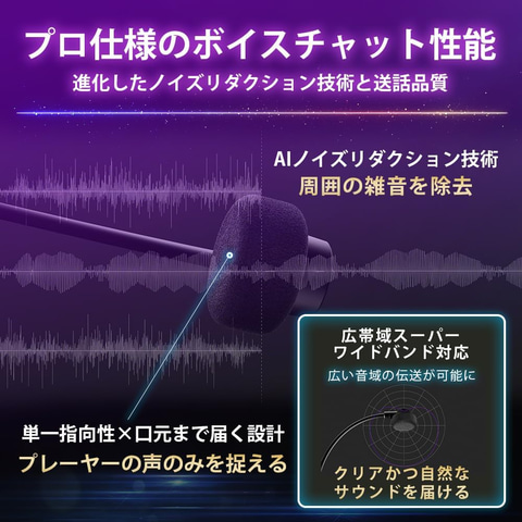 260g(マイク含まず)の軽量設計で快適性と遮音性を両立。長時間プレイ可能なロングバッテリーは連続使用時間30時間を実現(マイク非使用/ノイズキャンセリングOFF時)。低遅延2.4GHzワイヤレス接続とBluetooth Classic/LE Audio、有線接続に対応している。