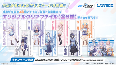 コンビニエンスストアのローソンと「ブルアカ」との新たなコラボが決定した。今回のコラボでは「自警団」のスズミ、レイサ、「救護騎士団」のミネ、セリナ、ハナエ、「図書委員会」よりウイ、シミコの7人が抜擢。対象商品を3点購入するとクリアファイルが貰えるキャンペーンが実施される。
