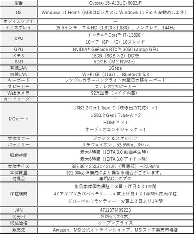 「Cyborg-15-A13UC-6022JP」は厚み22.9mm、重量約1.98kgという薄型・軽量設計により持ち運びも便利なゲーミングノートモデル。CPUにはCore i7-13620Hを搭載し、ゲームプレイや動画編集、マルチタスク処理も快適にこなせる。GPUにはGeForce RTX 3050 Laptop GPUを採用し、国内向けオンラインゲームをはじめ、様々なジャンルのPCゲームをフルHD解像度で楽しめるゲーミング性能を備えている。