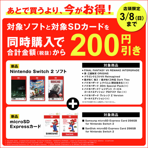 今なら、対象のNintendo Switch 2 ソフトとSDカードを同時購入で、合計金額(税抜)から✨200円引き✨
