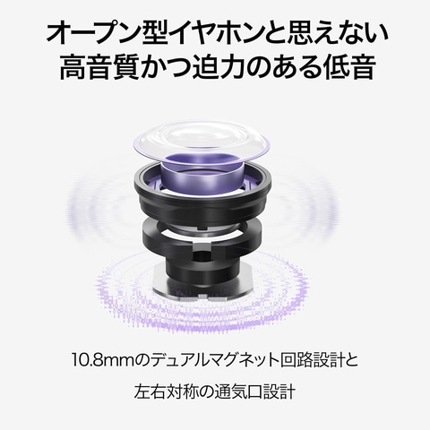 イヤホン単体の質量は約5.6g。イヤーカフ型で、左右対称のデザインを採用。どちらの耳に装着しても自動的に左右の耳を識別する。また、逆音波システムにより、音量を調整しつつ外部に漏れる音波を巧みに逆音波で打ち消すことで、音漏れを極限まで抑えられる。