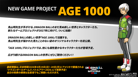 「AGE 1000」プロジェクトでは、他にも個性豊かなキャラクターが登場するという。詳細についてはロサンゼルスにて4月19日・20日開催予定のイベント「ドラゴンボールゲームスバトルアワー2026」にて発表される予定。
