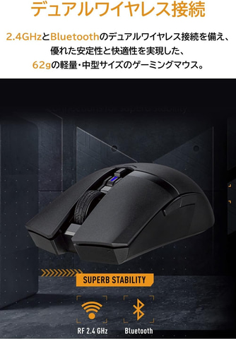 両手利き用デザインで62gの中型・軽量ゲーミングマウス(電池、ドングルを除く)。12,000dpi光学センサーで感度を4段階で調整可能となっている。