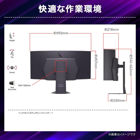 有機ELの美しさに加え、一般的な16:9より実際の視界に近づく33%横に長い解像度5,120×2,160の21:9ウルトラワイド画面と半径80cmとなる曲率800Rの画面がまるで包み込むような臨場感を演出する。応答速度は0.03msに対応。