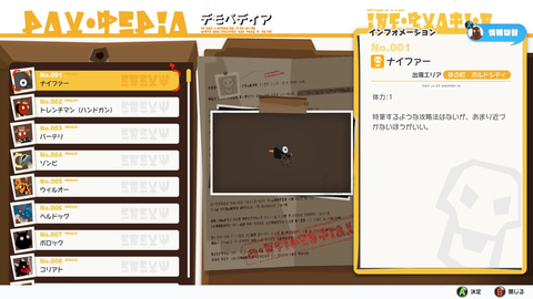 「色違い」ではない、個性的でギミックに富んだ敵キャラクターが80種類以上登場する。宝箱やアイテムになりすます敵や、破壊しても再生するギミックなど、一筋縄ではいかないバトルが楽しめる。敵の情報は「デモペディア」でチェック可能。「デモペディア」ではエネミーの名前はもちろん、生態などの詳細なデータまで網羅されている。