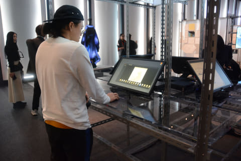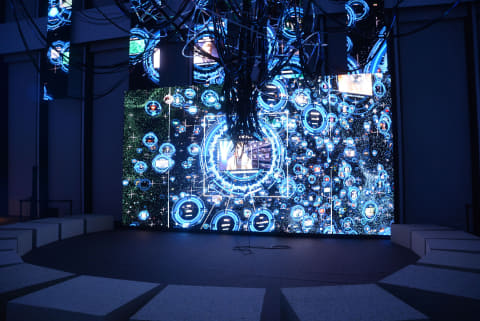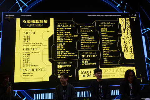 ここからは実際のイベントの会場を見ていこう。来場者が最初に訪れるのは「NODE(接点)」と呼ばれる広大な空間。ここではプロジェクションマッピングで「攻殻機動隊」の世界が映し出されるだけでなく、端末で作品のこまかいシーンを検索、登場人物や物事を知ることができる。