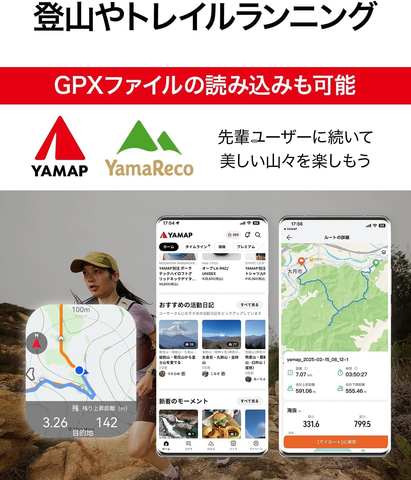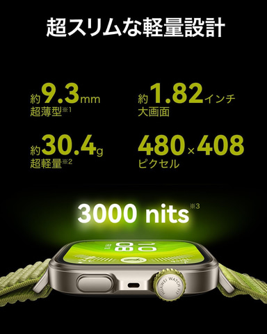 厚さ約9.3mm、重さわずか約30.4gのスリムなボディに、超強力なチタン合金ベゼルと航空機グレードのアルミニウム合金を採用。1.82インチのディスプレイはサファイアガラスで頑丈にカバーされ、3,000nitsの明るさでアウトドアでも鮮明に見える。