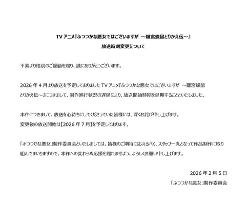 2026年4月より放送を予定しておりましたTVアニメ『ふつつかな悪女ではございますが ~雛宮蝶鼠とりかえ伝~』につきまして、制作進行状況の遅延により、放送開始時期を延期することといたしました。…pic.twitter.com/0YM9HFZtyo