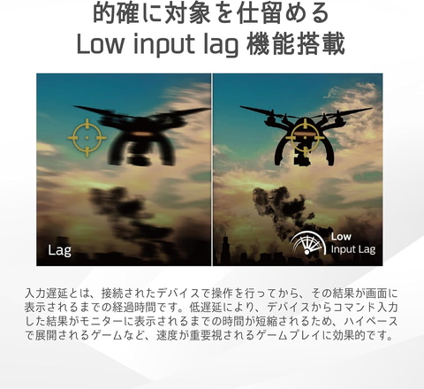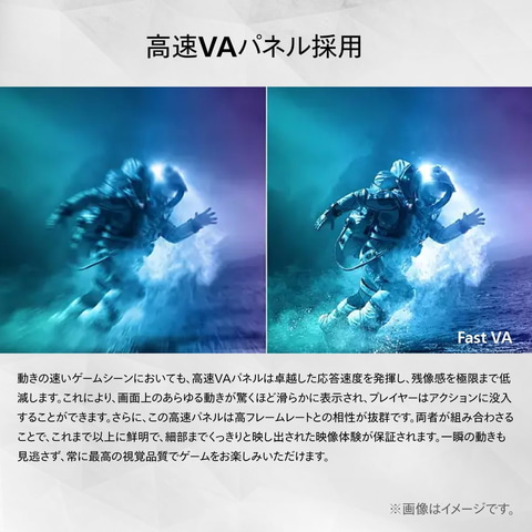 本製品は、高速VAパネルを採用。VAパネルよりも4倍高速に動作するだけでなく、高フレームレートとの組み合わせも優れており、鮮明な画像と高速なゲーム品質を両立する。また、180Hzのリフレッシュレートにより画面がぼやけず、滑らかに表示され、ひとつひとつのシーンがよりはっきりと見えるようになる。さらに、MPRT 0.5msの高速応答速度は、ぼやけやゴーストを大幅に抑制する効果があり、素早い動きを伴うゲームの快適性を高める。