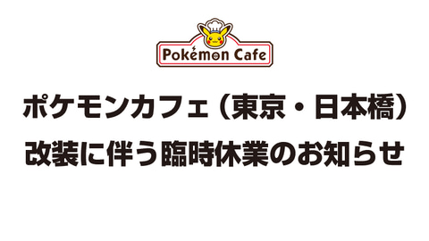 ポケモンは東京都中央区日本橋の「ポケモンカフェ(東京・日本橋)」にて、3月23日から6月下旬まで改装のため臨時休業する。