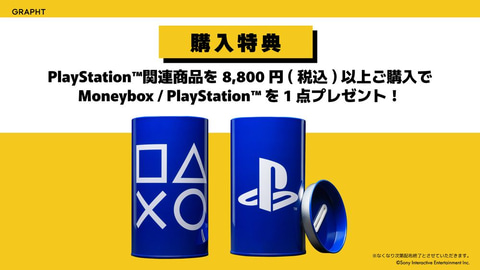 「PlayStation」関連製品を8,800円以上購入すると「Moneybox / PlayStation」がもらえる。1会計につき特典は1点まで。なくなり次第終了となる。
