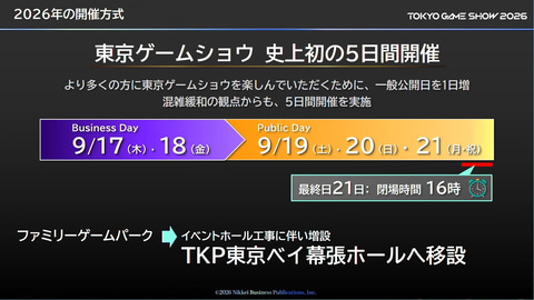 9月17日より21日にかけて開催予定の「TGS2026」。より多くの方に来場してもらうと共に、混雑緩和の観点から5日間開催となり、今回のテーマは「史上最長、遊びつくしの5DAYS」であることが発表された。また、5日間の来場者数は30万人を想定する。