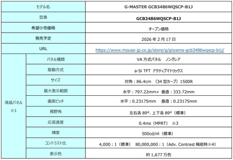 マウスコンピューターは、液晶ディスプレイブランド“iiyama”(イイヤマ)より34型ゲーミングモニター「GMASTER GCB3486WQSCP-B1J」を2月17日からAmazonにて販売開始する。価格は54,980円。