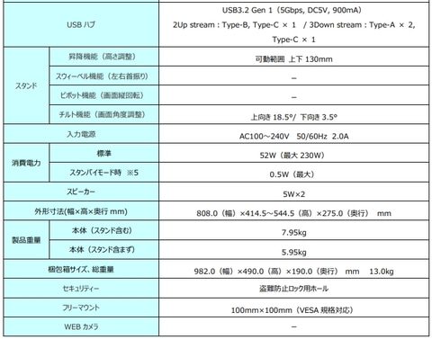 HDMI(1.8m)、DisplayPort(1.8m)、USB Type-A to B(1.5m)、USB Type-C to C(1.5m)が標準で付属する。さらに、AC100V対応の電源コード(1.8m)も同梱されており、購入後すぐに最適な表示環境を構築することができる。
