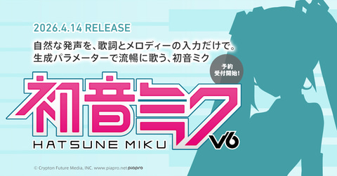 クリプトン・フューチャー・メディアは、歌声合成ソフトウェア「初音ミク V6」を4月14日に発売する。2月18日から予約受付を開始し、価格はボイスバンク単体が10,780円、「VOCALOID6 Editor」を同梱したスターターパックが24,200円。