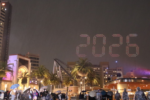 ドローンショーはパーク入口付近にある「ユニバーサル・グローブ」周辺で開催。内容は25周年を祝う内容で、ウッディー・ウッドペッカーとウィニー・ウッドペッカーの姿が映し出されたほか、開業年の「2001」から25周年となる現在「2026」までのカウントダウン、そして25周年のテーマ「Discover U!!!」がUSJの夜空に浮かび上がった。