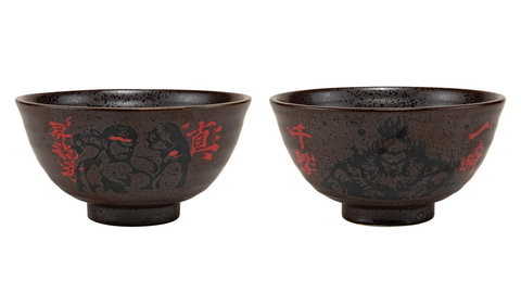 全体をこげ茶でまとめた、落ち着きのある美濃焼の茶碗。リュウと豪鬼それぞれの描き下ろしアートを使用し、キャラクターの主線は落ち着きのあるブラックにすることで必殺技名が引き立つデザインに仕上がっている。