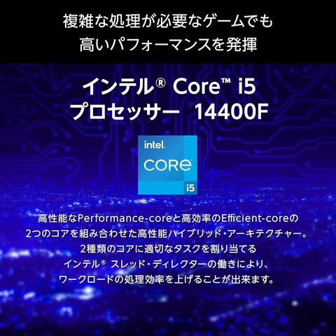 CPUにインテル Core i5 14400F、GPUにNVIDIA GeForce RTX 5060を搭載したデスクトップモデル。