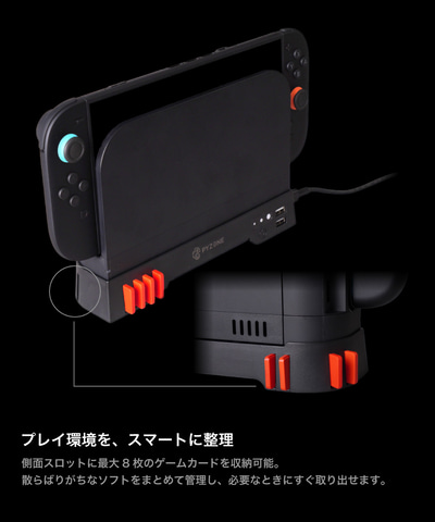 設置は本体をセットしてUSBケーブルを接続するだけの工具不要設計。側面にはゲームカードを最大8枚収納できるスロットを備え、散らばりがちなソフトをスマートに管理できる。