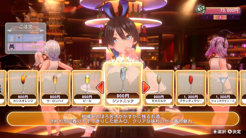 バニーガーデンは、紳士のための癒やしとトキメキに満ちた社交場。豊富に揃ったお酒やおつまみを味わいながら、個性豊かなキャストたちとの会話を存分に楽しめる。キャストの好みに合わせたメニューを注文すれば、好感度が上がることも。さらに、お酒が進み彼女たちが酔うと、普段は見せない一面を覗かせてくれるかもしれない。