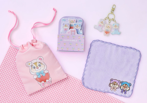 ぬいぐるみやぬいぐるみキーチェーンは、フードを外すことも可能で、それぞれ違ったスタイルを楽しめるのがポイント。また、部屋を賑やかに彩るカーテンタッセルが登場。チップとデールがカーテンに抱きつくデザインがキュートで、ペア使いもできる。そのほか、クリアファイルやメモセットなど学校やオフィスで活躍するステーショナリーも用意されている。