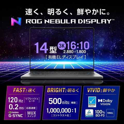 ディスプレイ:14.0型 OLED(有機EL)、グレア、2,880×1,800ドット(120Hz)