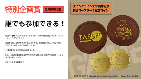 達成電器の公式Xをフォローし、3月14日に達成電器が発信する「GWC2026」の投稿にLIKE(いいね)と「#GWC2026」のハッシュタグを付けリポストした人の中から、抽選で3名に「G'AIM'E×タイムクライシス」30周年記念特別コイン&コースターセットが当たる特別企画賞も用意される。コメントをすれば当選率がアップする。なお結果発表は4月14日に行なわれ、当選者にはDMが送られる。
