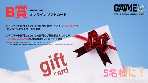 A賞は、直径7cmのずっしりと重みのある「GWC2026」と「タイムクライシス」30周年記念のコラボメダル。裏面には希望の名前が印字される。また、B賞は各部門の優勝者と参加者全員の中から3名に、最大8万円分のAmazonオンラインギフトカードが贈られる。