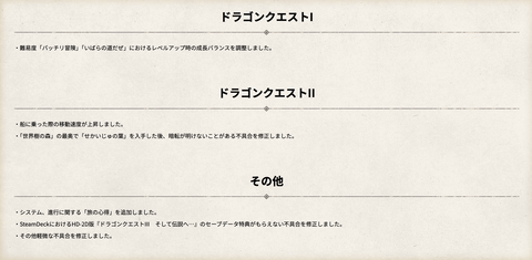 今回のアップデートでは、「ドラゴンクエストI」における難易度「バッチリ冒険」、「いばらの道だぜ」のレベルアップ時の成長バランスを調整。また「ドラゴンクエストII」では船に乗った際の移動速度が上昇しているほか、「世界樹の森」の最奥で「せかいじゅの葉」を入手した後、明度が明けないことがある不具合を修正している。