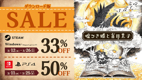 「絵本」シリーズの原点「嘘つき姫と盲目王子」の、Steamおよび日本一PCゲームズにて遊べるダウンロード版が3月11日24時より配信される。また、配信を記念して、各プラットフォームにてセールも行なわれる。