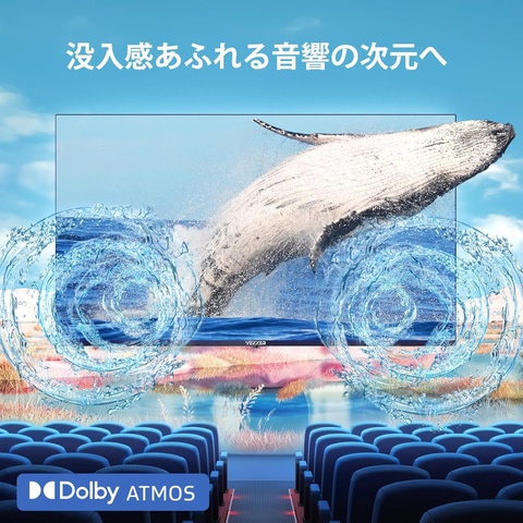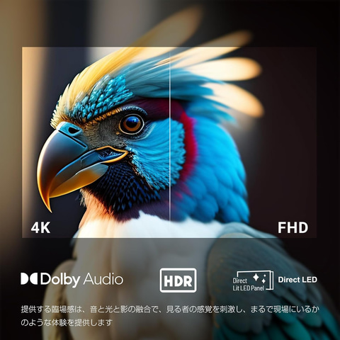 4K・HDR映像に対応。暗部から明部までバンディングが目立たず、きめ細やかで奥行き感のある高画質を実現する。また、ドルビーオーディオは没入感のあるサウンド体験を提供し、ハイフィデリティのステレオ音とサラウンド効果で、細かい音まで鮮明に聞こえる。