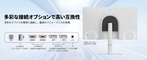 また、HDMI 2.0×2(2560×1440@144Hz)とDisplayPort 1.4×2(2560×1440@240Hz、OC 275Hz)を装備し、PCはもちろんPS5やXbox Series Xなどの最新ゲーム機ともシームレスに接続できる。