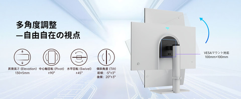 スタンドは高低、回転、傾斜、ピボットに対応し、VESAマウントにも対応。プレイスタイルに合わせて最適な視野角を自由に構築できる。