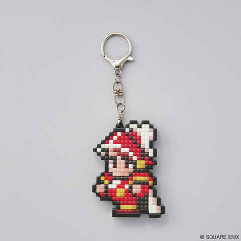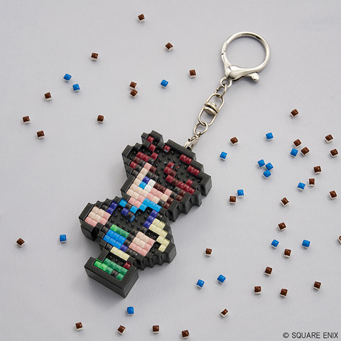本商品は、「ファイナルファンタジー」に登場するキャラクターたちをドット絵デザインで再現したグッズ。土台とビーズが入っており、付属の見本を参考に、土台にビーズをはめ込んでいく。取り外し可能なチャームが付いており、外して飾ることもできる。