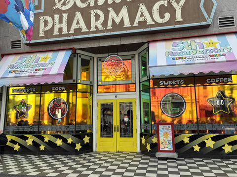 「マリオ・カフェ&ストア」は、「スーパー・ニンテンドー・ワールド」のエリア外にあるカフェ。5周年記念イベントに際し、外装と内装も5周年仕様に飾り付けされている。