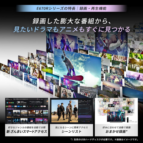 「E670R」は、レグザエンジン「ZR」を搭載した2025年モデル。地デジAIビューティが番組の気になるノイズを抑え、くっきりとした高画質を実現する。また、「レグザ重低音立体音響システム Z」により、クリアな高音から重低音まで立体的で迫力のあるサウンドを楽しめる。