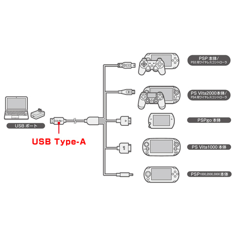 本商品はUSB ACアダプタや、PCやモバイルバッテリー等の「USB Type A ポート」から、5つ又に分岐した端子それぞれに対応したゲーム機本体やコントローラーを充電することが出来るマルチ機種対応のUSB充電ケーブル。