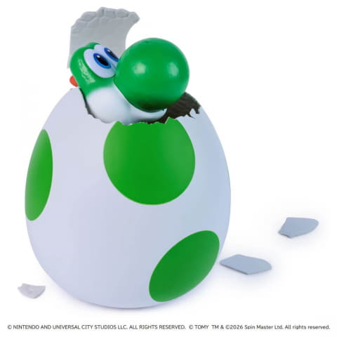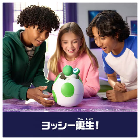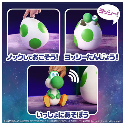 映画「ザ・スーパーマリオギャラクシー・ムービー」より、ヨッシーがタマゴから生まれるシーンを再現したおもちゃが登場。タマゴの下部をやさしくノックしたり、左右にゆらゆら揺らすことでふ化がはじまり、ヨッシーが殻を割って生まれてくる様子を楽しめる。