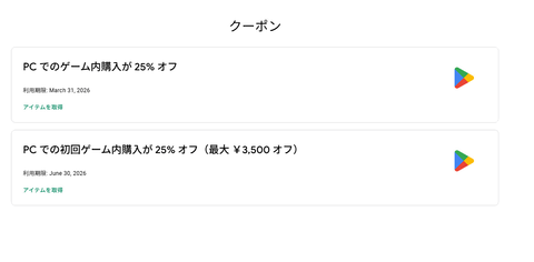 - 【Google Play Games:「PCでのゲーム内購入が25%オフ」クーポン】